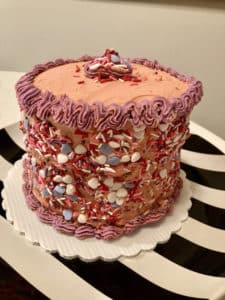 a picture of a cake with pink frosting and mauve decorations, with heart shaped sprinkles on the sides