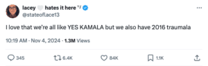 Screenshot 2024-11-05 at 07-18-17 lacey 🤍 hates it here ⸆⸉ on X I love that we’re all like YES KAMALA but we also have 2016 traumala _ X Posted on November 5, 2024 by Karen