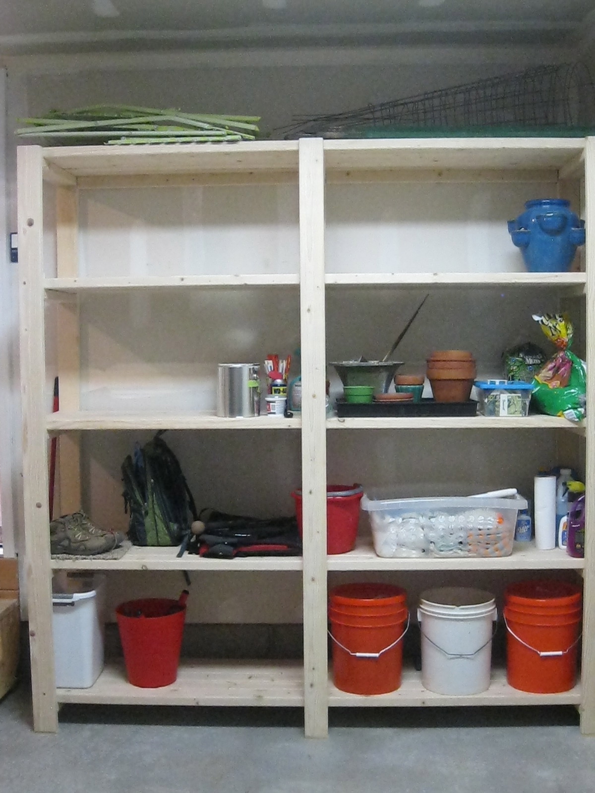 It took over a year for me to get it done, but I now have shelves in the garage. (I feel like Elwood in my favorite clip.) Look at the storage capacity–a cat and a bucket!