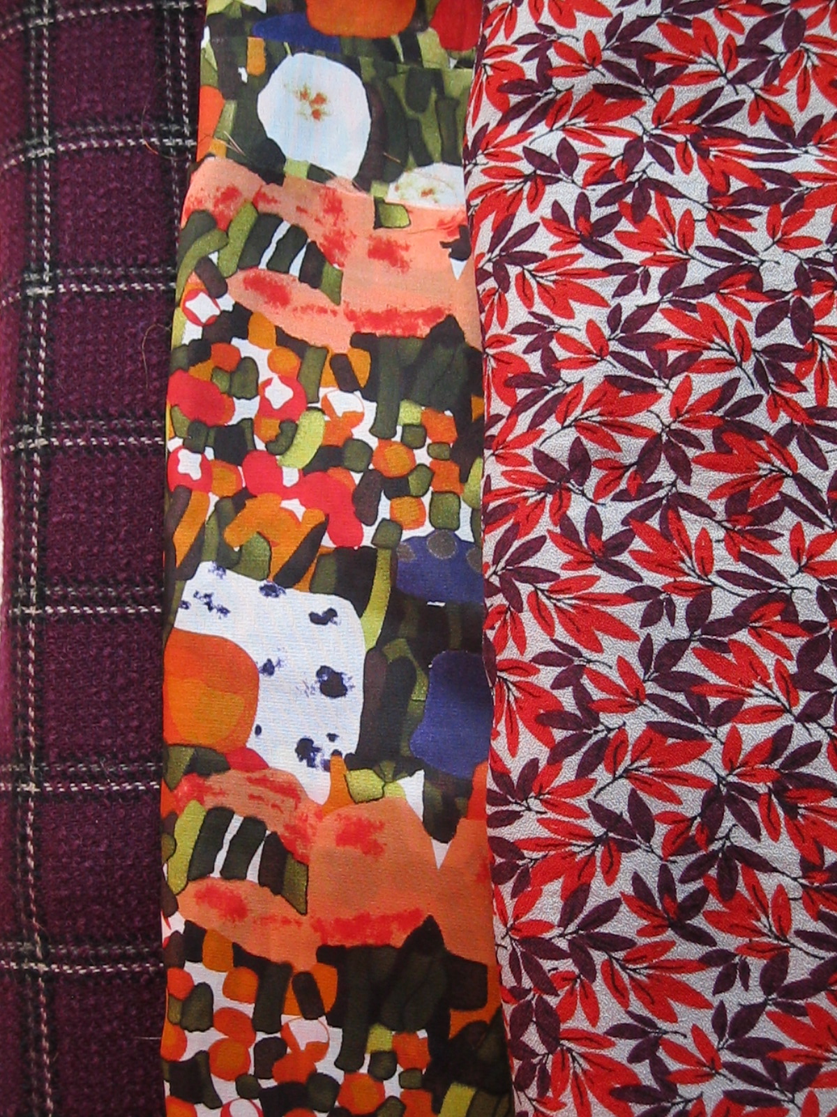 Fortunately there’s (from left to right) wool suiting, cotton-silk print that’s a mill end from J. Crew, and some leafy French rayon to help with the acceptance process.(All three are from the local Yellow Bird Fabrics.)