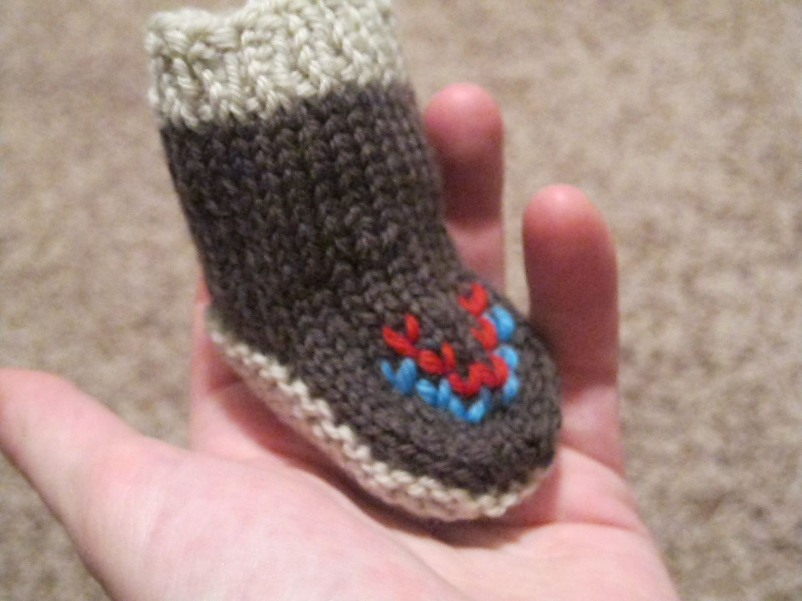 Anyway, this co-worker is having a little boy and is very hip, so I went with a pair of moccasin-booties, using this free pattern: