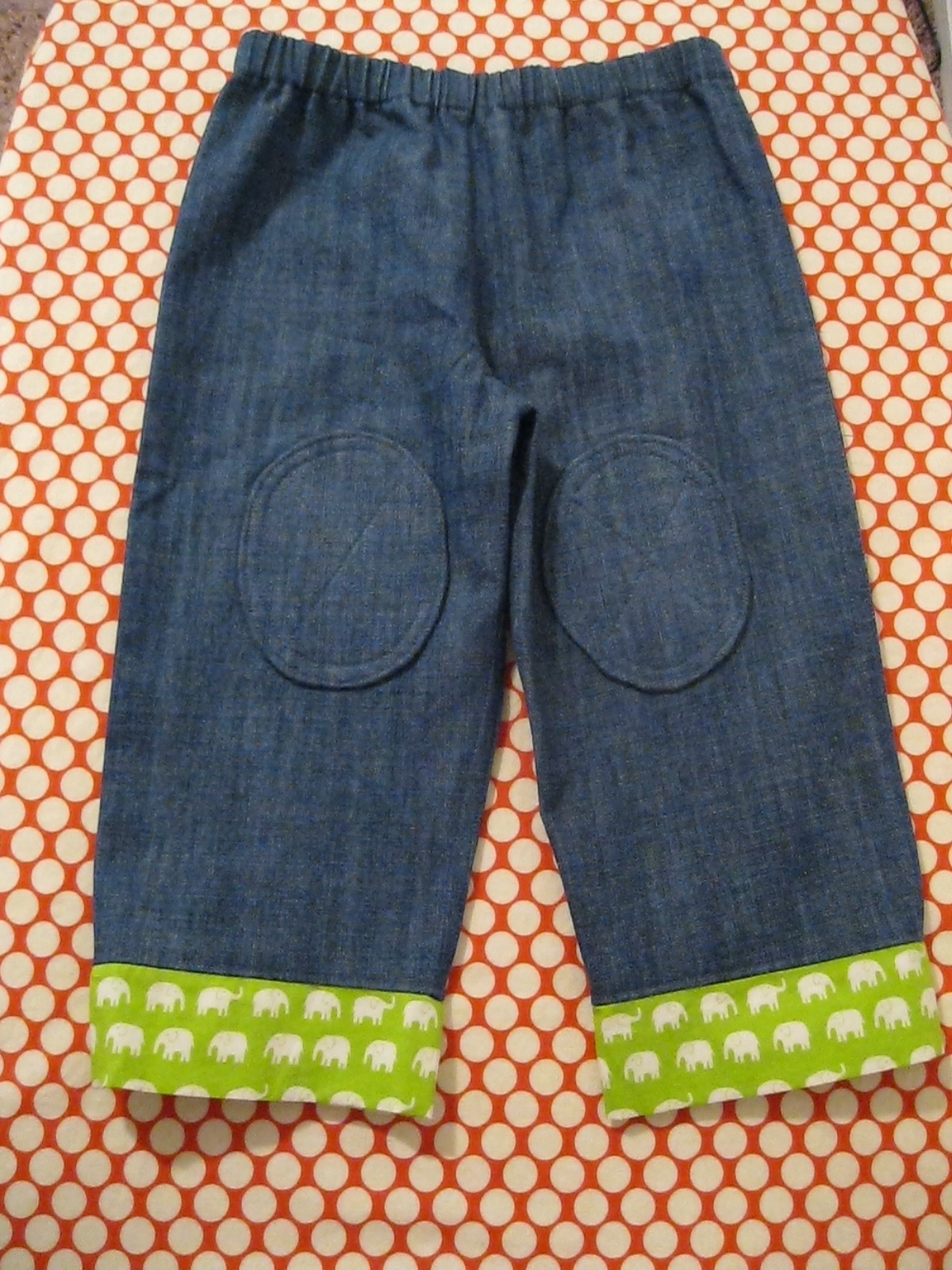 And what does a stylish baby wear with his cardigan? Matching pants, of course, with elephant fabric on the cuffs. (I even tried out flat-felled seams on these, so they met my 3+1 Things goal.)