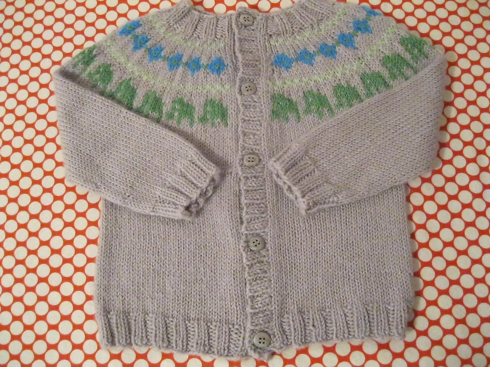 This is a little sweater with elephants on it (the green blobs), from this pattern. It turned out pretty big, so I think Nephew will be able to wear it his second winter.