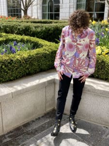 a full length picture of a woman in black pants and a psychadelic print shirt in mauves and purples. She is in a courtyard garden and lookng down.