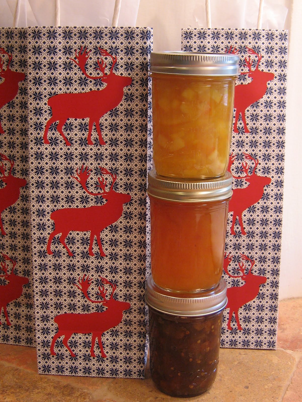 From the top that’s marmalade, rosemary-peach jam, and green tomato chutney.