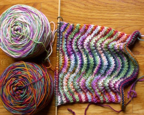 This was going to be a pair of striped legwarmers that used two different variegated yarns to created the effect of many colored stripes, something like this:
